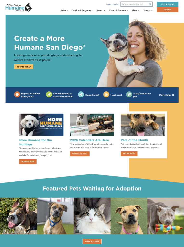I led them through a discovery process to discuss their current challenges and goals, then we did a user survey to gather feedback. We used that feedback to put together a new site map and content strategy that streamlined all pages in the site. I designed a new look and feel for the site inspired by their newly renovated adoption building. I built the site in WordPress using a page building tool and created a library of reusable design elements and templates so they can easily maintain the site on their own.